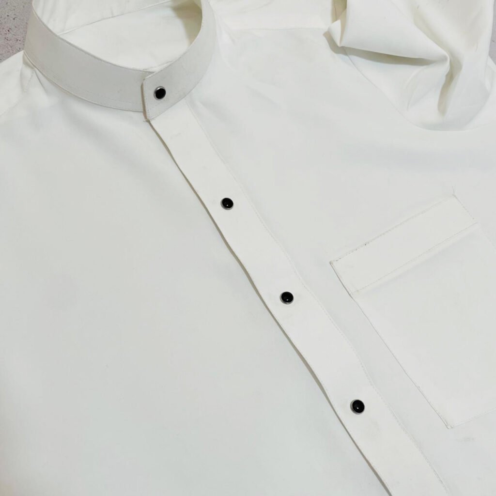 Every white thawb we produce is crafted using 100% polyester thiybo fabric, renowned for its soft feel, wrinkle-free texture, and long-lasting durability. Our tailoring team ensures each piece maintains a smooth fall, crisp collar, and clean finishing from cutting to stitching. The front placket features neatly aligned buttons, and every seam is reinforced to maintain the garment’s structure while offering comfort.